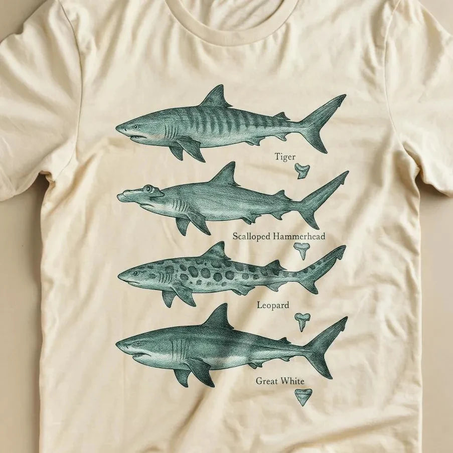 Introduce your little ones to the fascinating world of marine life with our Shark Species T-Shirt. This vintage-style tee features stunning illustrations of the Tiger Shark, Scalloped Hammerhead, Leopard Shark, and Great White, making it a perfect choice for young ocean enthusiasts.