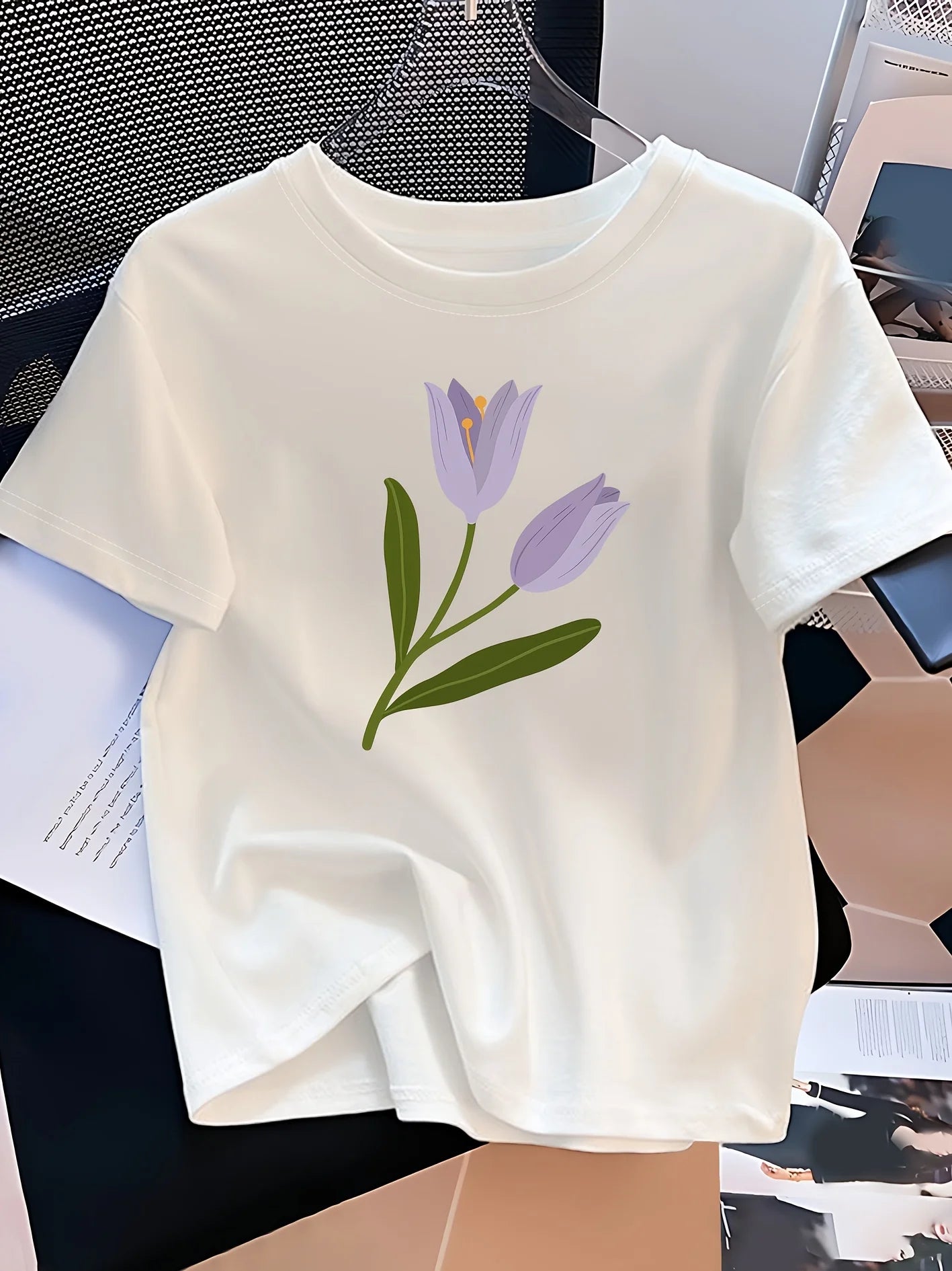 Kids' Casual Crew Neck T-shirt with Tulip Print